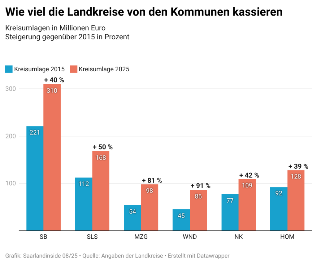 Die Lage verschärft sich. Beispiel Regionalverband Saarbrücken. Der will 2026 seinen elf Gemeinden 42 Millionen Euro mehr Umlage abverlangen; das ist so viel wie der gesamte Haushalt der Gemeinde Heusweiler. Die FDP-Fraktion hat den Haushalt abgelehnt. Was ihr Fraktionschef Roland König sagt, gilt für alle Landkreise: „Der Regionalverband darf nicht zum Umlagenautomatismus verkommen. Wer keine Mittel mehr hat, kann sich auch nicht mehr selbst verwalten.“