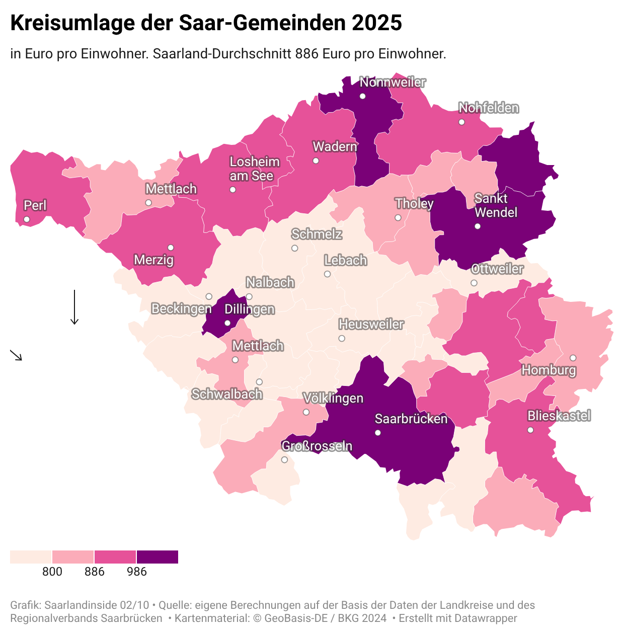 Kreisumlagen zwischen 700 und 1.300 Euro pro Kopf Die Landkreise haben keine eigenen Steuereinnahmen. Die Städte und Gemeinden müssen dafür die Kreisumlagezahlen, in unterschiedlicher Höhe. Grundsatz: Je mehr Gewerbe- und Grundsteuern die Gemeinde einnimmt, desto mehr muss sie für den Kreis hergeben. Steuerschwache Kommunen wie Schwalbach, Beckingen, Friedrichsthal, Nalbach und Rehlingen-Siersburg zahlen pro Kopf etwa 700 Euro, während die wirtschaftlich stärkeren St. Wendel, Saarbrücken, Nonnweiler, Dillingen und Freisen zwischen 1.000 und 1.300 Euro pro Einwohner abführen. ➡️Hier die Gemeinden auf der Saarland-Karte anklicken