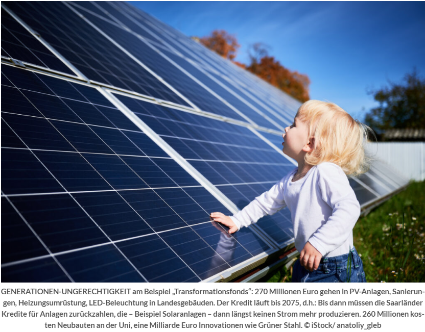 Die Saarländer werden also bis 2075 für Schulden aufkommen, die ihre Väter und Mütter 50 Jahre zuvor gemacht haben, zum Beispiel für Photovoltaik-Anlagen, die im Jahre 2075 schon lange keinen Strom mehr einspeisen werden.